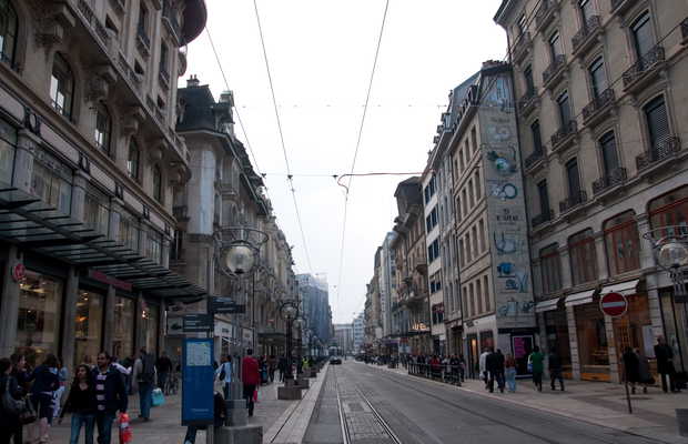 Entre o lago e o centro histórico está a área de compras de Genebra. Um par de ruas movimentadas durante o dia, cheias de lojas de todos os tipos.